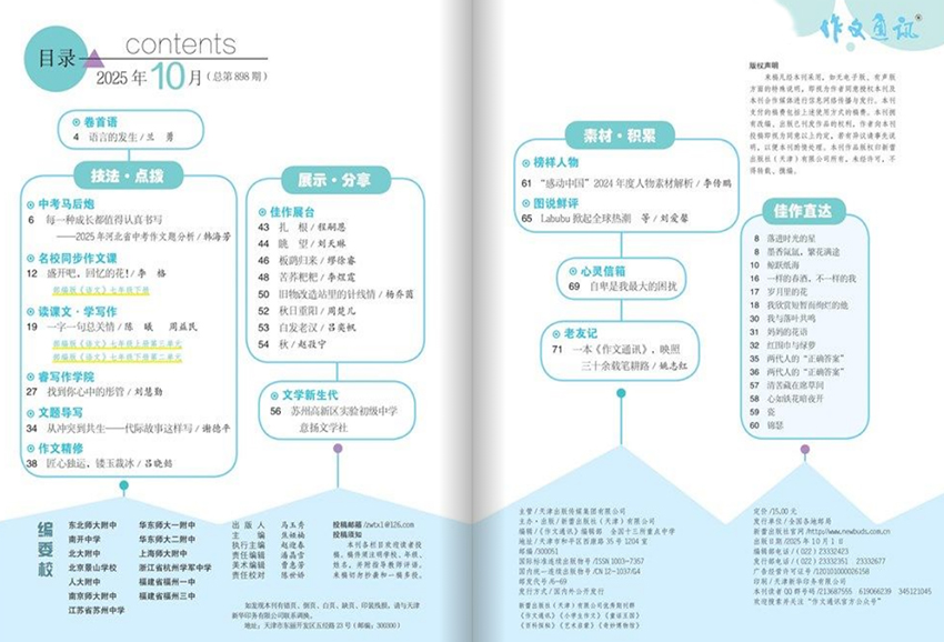 雜志內(nèi)容體系科學完整,欄目設(shè)置豐富多元。設(shè)有“名校佳作”“考場滿分作文”“寫作技法”“素材積累”“名師講堂”“同題競寫”“病文升格”等經(jīng)典欄目。其中,“名校佳作”精選全國重點中學學生的優(yōu)秀習作,展現(xiàn)不同風格與思路的寫作范本;“寫作技法”則系統(tǒng)講解各類文體的寫作技巧,從開頭結(jié)尾到過渡銜接,從語言潤色到論證方法,層層遞進,循序漸進;“素材積累”聚焦社會熱點、經(jīng)典名著、歷史人物與科技人文,為學生提供新鮮、典型、可遷移的寫作“彈藥庫”,解決“無米下炊”的難題。