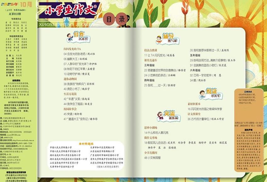 《小學(xué)生作文》雜志內(nèi)容體系科學(xué)、層次分明,欄目設(shè)置豐富多樣,極具針對性與實(shí)用性。設(shè)有“佳作展臺”“名師點(diǎn)評”“寫作小錦囊”“同題競寫”“好詞好句積累”“病文升格”“趣味練筆”等經(jīng)典欄目?!凹炎髡古_”精選全國各地小學(xué)生的優(yōu)秀習(xí)作,題材廣泛、語言生動、情感真摯,為同齡人提供可學(xué)可仿的寫作范本;“名師點(diǎn)評”邀請一線特級教師、教研員對作文進(jìn)行逐段分析,點(diǎn)明亮點(diǎn)、指出改進(jìn)方向,幫助學(xué)生理解“好作文”的標(biāo)準(zhǔn);“寫作小錦囊”則以通俗易懂的語言,講解審題技巧、結(jié)構(gòu)安排、細(xì)節(jié)描寫、開頭結(jié)尾等實(shí)用技法,讓孩子“一學(xué)就會,一用就靈”。