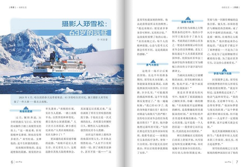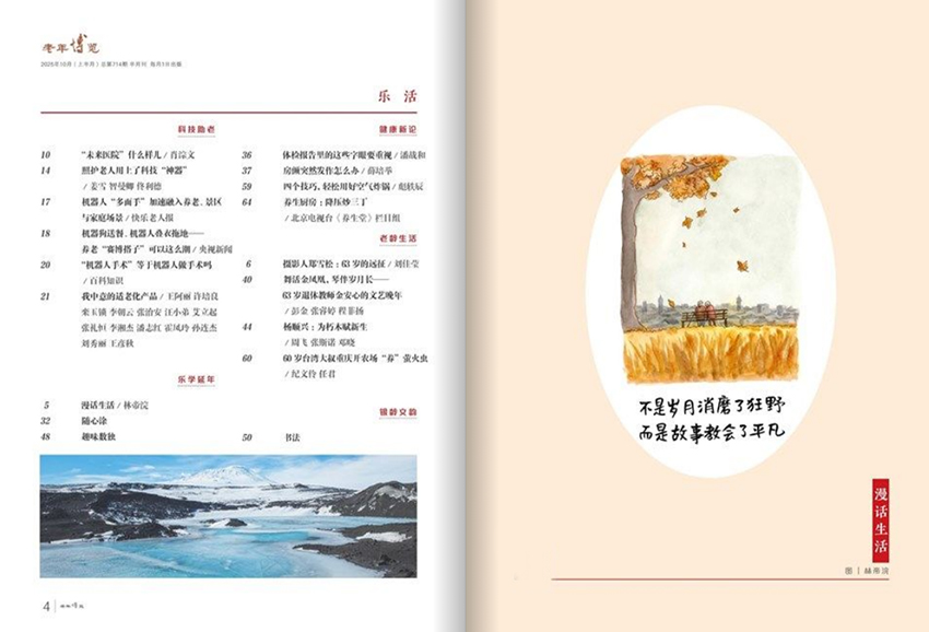 《老年博覽》在提升生活質(zhì)量方面,雜志內(nèi)容涵蓋文史、情感、旅游、心理、家庭關(guān)系等多個(gè)維度?!锻侣洝贰段氖烽L(zhǎng)廊》《人物寫真》等欄目帶領(lǐng)讀者重溫歷史、感悟人生,激發(fā)對(duì)生活的熱愛;《雜談隨想》《快樂生活》則關(guān)注當(dāng)下的精神世界,鼓勵(lì)老年人培養(yǎng)興趣愛好,參與社會(huì)活動(dòng),保持樂觀心態(tài)。此外,雜志還介紹國內(nèi)外適合老年人的旅行方式、新型養(yǎng)老模式和科技產(chǎn)品,如“泡泡帳篷旅館”“智能健康監(jiān)測(cè)設(shè)備”等,拓寬視野,擁抱新時(shí)代的生活方式。