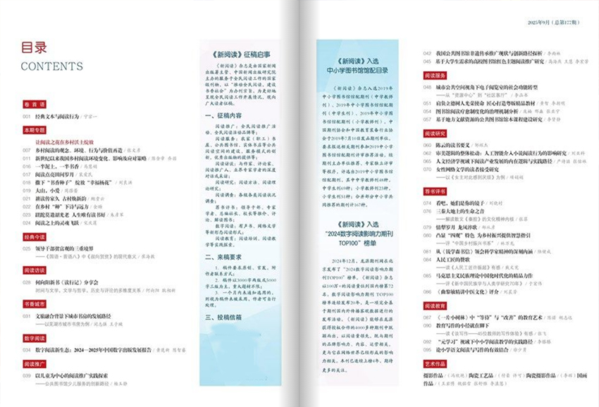 《新閱讀》雜志是國內(nèi)推動全民閱讀活動的重要載體和大眾閱讀的權(quán)威指南。作為一份兼具思想深度與文化品位的綜合性刊物,雜志始終堅持以“為廣大讀者服務(wù),為幸福人生導(dǎo)航”為核心辦刊宗旨,在總局的關(guān)懷與指導(dǎo)下,積極踐行文化使命,致力于推薦優(yōu)秀作品、引領(lǐng)閱讀時尚,推動中國特色社會主義文化的繁榮發(fā)展。 本刊定位為大眾閱讀的引領(lǐng)者,聚焦文史類、時政類等高品位內(nèi)容,所刊文章均選自國內(nèi)正式出版的圖書、報紙及期刊,經(jīng)過專業(yè)編輯團隊的精心篩選與整合,確保內(nèi)容健康、語言生動、富有教益且感染力強。通過“讓精品閱讀走進大眾”的辦刊方針,雜志不僅提升讀者的文化素養(yǎng)與精神品位,更致力于弘揚社會主義核心價值觀,傳承中華優(yōu)秀傳統(tǒng)文化,構(gòu)筑當(dāng)代中國人共有的心靈家園。