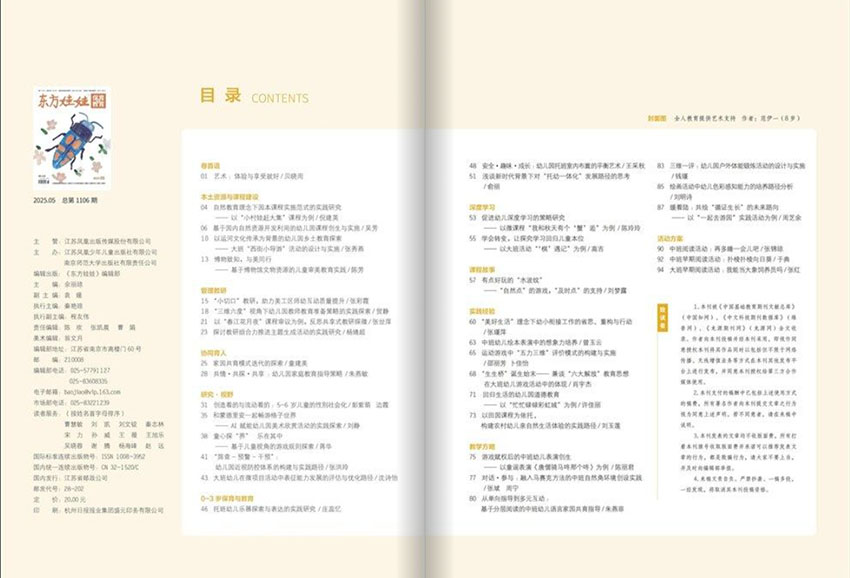 《東方娃娃保育與教育雜志》雜志秉承“扎根生活、陪伴成長”的核心理念,致力于傳播科學(xué)、前沿的早期教育思想與方法,是廣大家庭和幼教機構(gòu)信賴的育兒指南與專業(yè)資源。雜志內(nèi)容全面覆蓋兒童早期發(fā)展的關(guān)鍵領(lǐng)域,包括身體保育、營養(yǎng)健康、心理發(fā)展、行為認(rèn)知、情感與社會性培養(yǎng)等。它不僅提供權(quán)威的兒童發(fā)展心理學(xué)知識,更注重理論與實踐的結(jié)合,通過大量真實生動的案例、互動游戲設(shè)計和家庭活動建議,為讀者提供具操作性的育兒支持。 作為連接家庭與幼兒園的橋梁,該雜志特別關(guān)注家園共育。它為家長解析孩子成長中的困惑與挑戰(zhàn),也為幼教工作者提供豐富的教學(xué)資源和課堂活動方案,促進教育理念的同步與協(xié)作。其內(nèi)容深入淺出,既具專業(yè)性又不失親和力,能有效滿足不同讀者的多元需求。