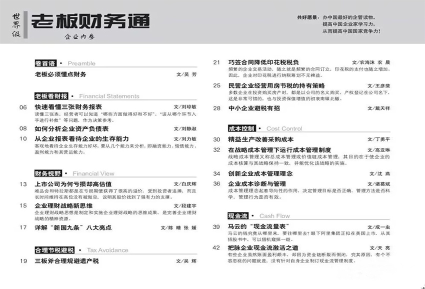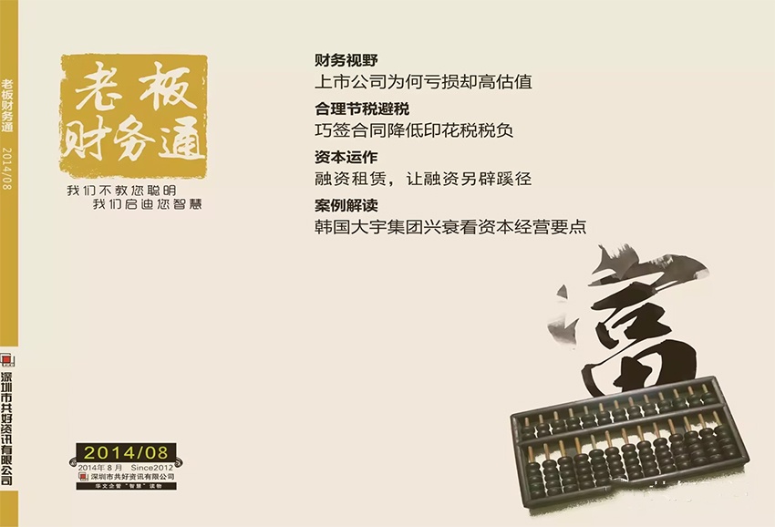 《老板財(cái)務(wù)通》是深圳市共好資訊有限公司研發(fā)的“華文企管《財(cái)商月刊》”系列核心刊物,以企業(yè)老板及中高層管理者為主要讀者群體。雜志秉承“用財(cái)務(wù)思維經(jīng)營(yíng)企業(yè)”的宗旨,聚焦企業(yè)財(cái)務(wù)管理痛點(diǎn),致力于幫助企業(yè)決策者“增值個(gè)人財(cái)富、規(guī)避財(cái)務(wù)危機(jī)、提前鎖定利潤(rùn)”,構(gòu)建系統(tǒng)化的財(cái)務(wù)管理能力。 作為國(guó)內(nèi)定價(jià)最高、無(wú)廣告的純內(nèi)容型經(jīng)管雜志,《老板財(cái)務(wù)通》年定價(jià)1580元,通過(guò)雜志鋪等平臺(tái)提供全國(guó)包郵服務(wù)。其讀者群體覆蓋制造業(yè)、服務(wù)業(yè)、科技企業(yè)等領(lǐng)域的決策層,被譽(yù)為“老板必備的財(cái)務(wù)智囊”。雜志還衍生出同名培訓(xùn)課程,由注冊(cè)會(huì)計(jì)師、注冊(cè)稅務(wù)師等專(zhuān)家授課,進(jìn)一步強(qiáng)化企業(yè)家的財(cái)務(wù)實(shí)戰(zhàn)能力。