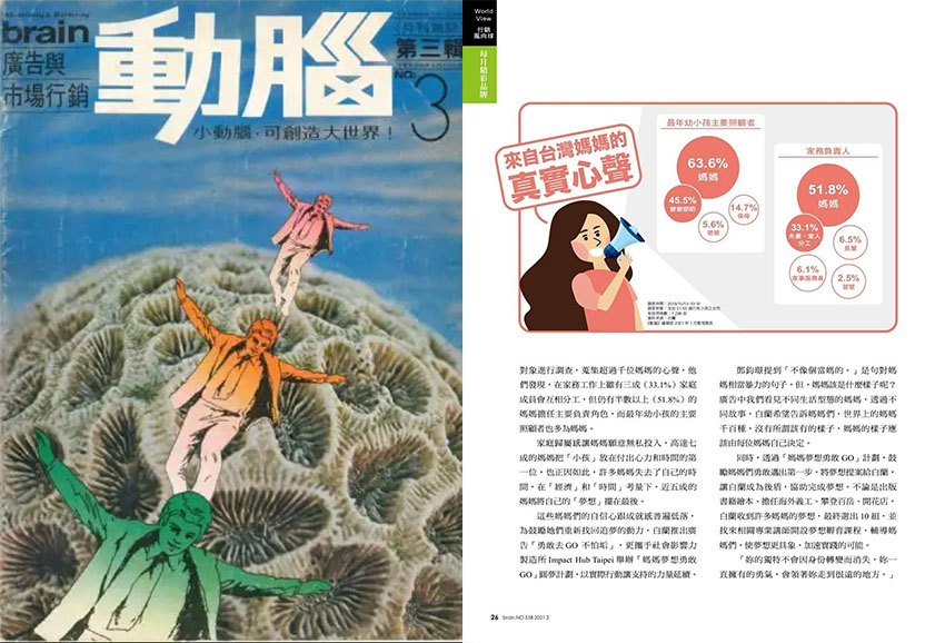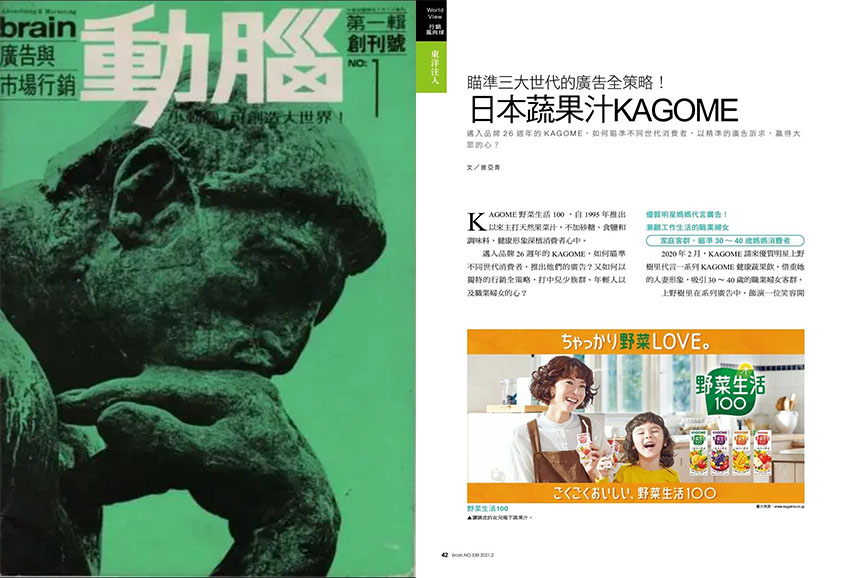 《動腦雜志》是華文地區(qū)行銷創(chuàng)意領(lǐng)域的標(biāo)桿性專業(yè)刊物,由動腦雜志社創(chuàng)辦于1977年,以“溝通創(chuàng)意、鼓勵創(chuàng)意精神,激發(fā)動腦風(fēng)氣”為創(chuàng)刊宗旨,歷經(jīng)四十余年深耕,已成為行業(yè)不可或缺的交流與資訊平臺。雜志為月刊,16開全彩印刷,發(fā)行網(wǎng)絡(luò)覆蓋臺、港、新、馬及美國等地的華文廣告界,讀者涵蓋廣告公司從業(yè)者、企業(yè)行銷公關(guān)人員及創(chuàng)意愛好者。
