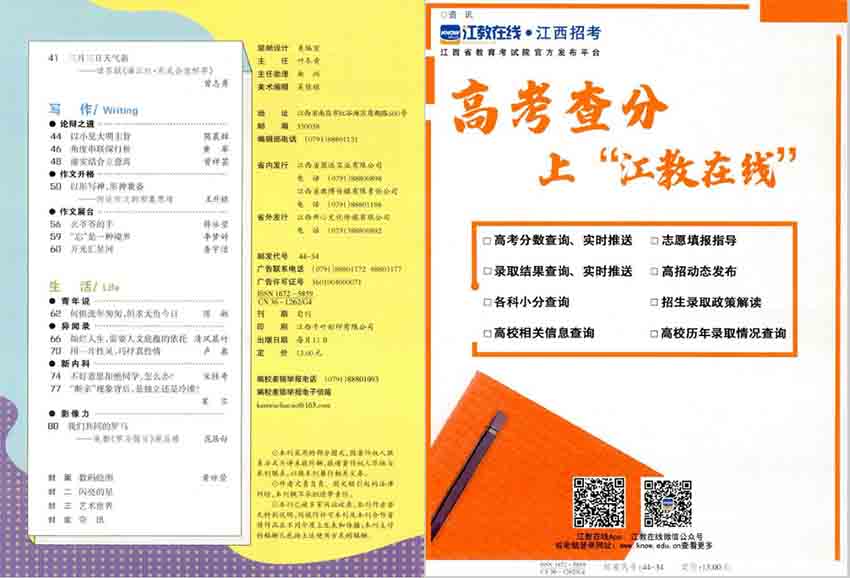全年一共12期,旬刊,單期48頁(yè),彩色銅版紙。出版單位:江西教育期刊社有限責(zé)任公司
