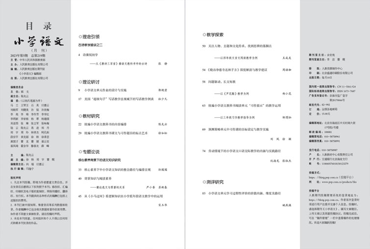 《小學(xué)語文》主要欄目:名家講堂、百年語文研究、實(shí)踐與反思、精品課堂、備課之窗、測試與評價(jià)、課外閱讀指導(dǎo)、教材解析、文本解讀、作家一席談、古詩詞鑒賞、港澳臺速遞、境外傳真、課改風(fēng)景線、學(xué)會動(dòng)態(tài)、讀書時(shí)間、語文人生。