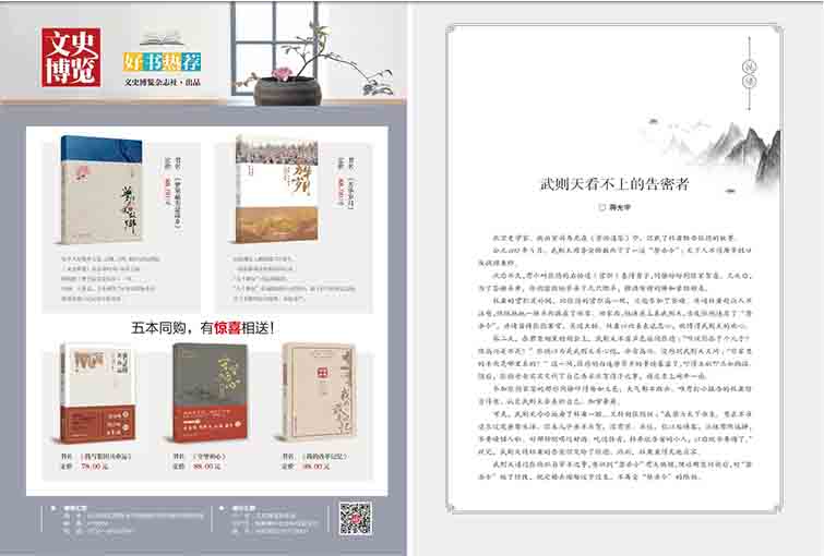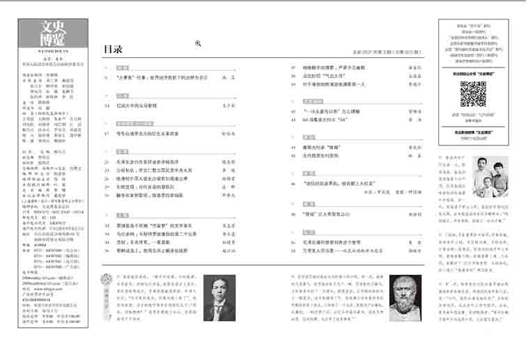 《文史博覽》雜志是中國歷史文化領(lǐng)域的學(xué)術(shù)刊物,由國內(nèi)著名的文史專家、學(xué)者和資深出版人共同組成的編輯及發(fā)行團(tuán)隊(duì)策劃出版,它以系統(tǒng)、深入、前沿的學(xué)術(shù)研究為基礎(chǔ),涵蓋了歷史學(xué)、文學(xué)、哲學(xué)、社會(huì)學(xué)、考古學(xué)等多個(gè)領(lǐng)域,是中國文化傳承、文化研究的重要載體。創(chuàng)立之初即定位為高端學(xué)術(shù)雜志,一直致力于引領(lǐng)學(xué)術(shù)前沿,積極倡導(dǎo)正確的學(xué)術(shù)價(jià)值觀,以推動(dòng)文化傳承、文化交流為己任,得到了廣大讀者及學(xué)術(shù)界的高度贊譽(yù)。