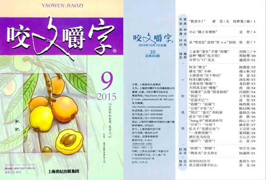 《咬文嚼字》(月刊)經(jīng)過多年的不懈努力,流行度高,大眾辨識度廣,創(chuàng)刊于1995年,開拓了視野,帶給讀者富有生活特色的內(nèi)容。中國上海之上海文化出版社,主要內(nèi)容則為糾正媒體藝人、名家作品的錯別字,而今月刊編輯委員則包含知名上海作家金文明等,《咬文嚼字》雜志的內(nèi)容頗具特色,已成為中國境內(nèi)漢語文化品質(zhì)“捍衛(wèi)者”的角色,并發(fā)起了多次“社會查找錯字活動”,形成一定影響。